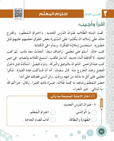 َﻟ َﻔ َﺖ ا ْﻧ ِﺘ َﺒﺎ َﻩ اﻟ ﱡﻄ ﱠﻼ ِب ُﻋ ْﻨ َﻮا ُن اﻟ ﱠﺪ ْر ِس ا ْﻟ َﺠ ِﺪﻳ ِﺪ) :ا ْﺣ ِﺘ َﺮا ُم اﻟـ ُﻤ َﻌ ﱢﻠ ِﻢ( .وا ْﻗ َﺘ َﺮ َح