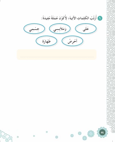 ُ ٦أ َر ﱢﺗ ُﺐ اﻟ َﻜ ِﻠ َﻤﺎ ِت اﻵ ِﺗ َﻴ َﺔ؛ ِ ُﻷ َﻛ ﱢﻮ َن ُﺟ ْﻤ َﻠ ًﺔ ُﻣ ِﻔﻴ َﺪ ًة: ِﺟ ْﺴ ِﻤﻲ َو َﻣ َﻼ ِﺑ ِﺴﻲ َﻋ َﻠﻰ َأ ْﺣ ِﺮ ُص َﻃ َﻬﺎ َر ِة ........................................................................... ٥٤